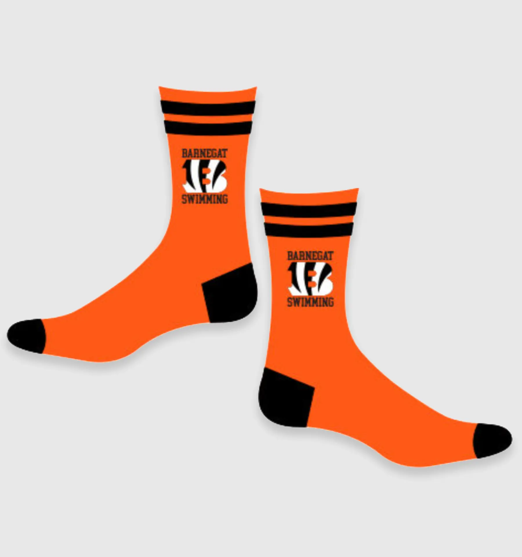Step up your team spirit and performance with these vibrant Barnegat High School Swim Team socks! Featuring the bold Barnegat “B” logo, these socks are packed with features designed for both style and comfort. Made with moisture-wicking technology to keep your feet dry, arch support for added stability, and a cushioned sole for all-day comfort, they are perfect for staying cozy and stylish on meet days or for everyday wear. The bright orange base with black accents creates a sharp, sporty look that lets you represent your team with pride.